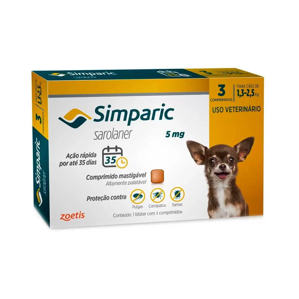 A linha Simparic conta com seis versões, cada uma desenvolvida para atender a uma faixa etária de peso diferente dos cachorros. No caso do Simparic 5mg, é indicado para cães que pesam entre 1,3 a 2,5kg.