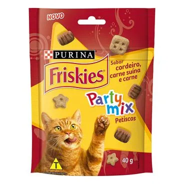 Petisco Friskies Party Mix Gatos Cordeiro, Carne suína e Carne é uma excelente opção para quem quer incluir um petisco de qualidade na rotina do seu gato.